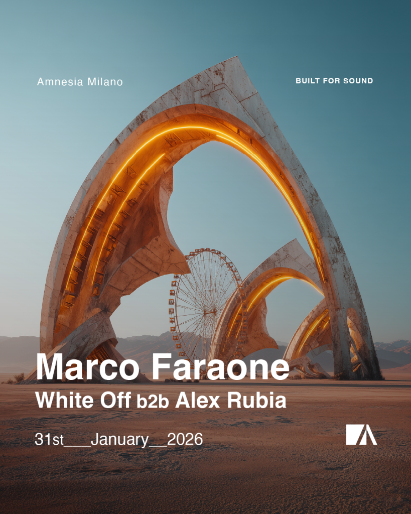 A sonic vision, an international vocation and perspective, an identity-driven and immediately recognizable style. These are the skills that Amnesia Milano and Marco Faraone share, coming together in the booth at the milanese club on January 2026, Saturday 31st alongside White Off b2b Alex Rubia.